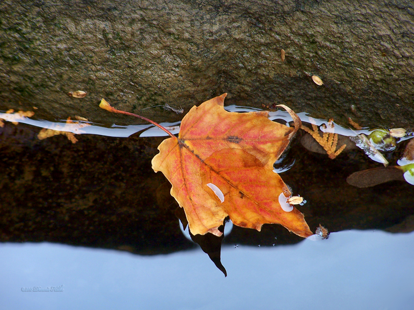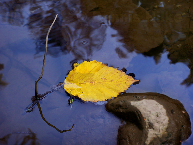 Read more..Leaf in creek with stone and bands of reflections. Horizontal 2576px X 1932px 3.52 MB